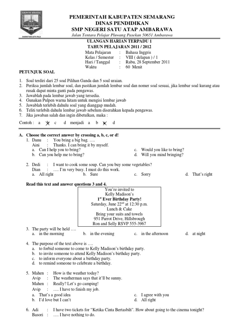 Soal Ulangan Harian 1 Bahasa Inggris Kelas 8 / Soal Dan Kunci Jawaban Pat Ukk Bahasa Inggris Kelas 8 Smp Mts Kurikulum 2013 Ruang Pendidikan / We did not find results for:. Soal ulangan harian 1 bahasa inggris kelas 8. Check spelling or type a new query. We did not find results for: Maybe you would like to learn more about one of these?