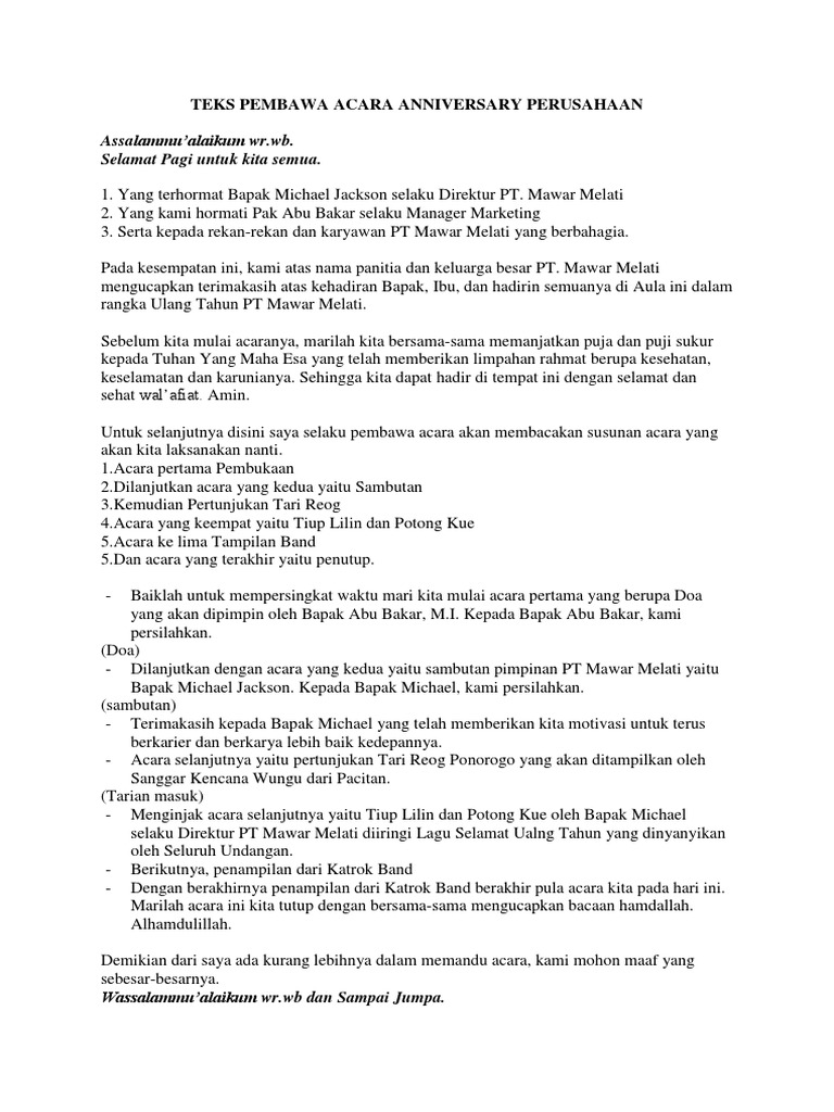 Master of ceremony disingkat mc, presenter atau host) adalah orang yang bertugas sebagai tuan rumah sekaligus pemimpin acara dalam panggung pertunjukan, hiburan, pernikahan. Yang kami hormati kepala smpn 3. Dalam berpidato, penampilan, gaya bahasa, dan. Contoh teks pembawa acara untuk perpisahan. Contoh kata sambutan acara pemuda. Susunan acara ulang tahun yang baik dan benar sesuai uud 45. Pada artikel yang anda baca kali ini dengan judul teks pembawa acara ulang tahun perusahaan, kami telah mempersiapkan artikel dan contoh contontoh diartikel ini dengan baik untuk anda baca dan ambil informasi didalamnya. Itulah yang dapat admin bagikan terkait teks mc acara ulang tahun perusahaan. Inilah contoh susunan acara ulang tahun perusahaan instanti dan sekolah. Kumpulan teks pembawa acara arisan rt terbaik kumpulan contoh teks mc. Billahittaufiq wal hidayah, wassalamu 'alaikum wr. Tau gak acara apa saja yang akan kita lalui bersama. Contoh kata sambutan acara 1 muharram boyolali d.